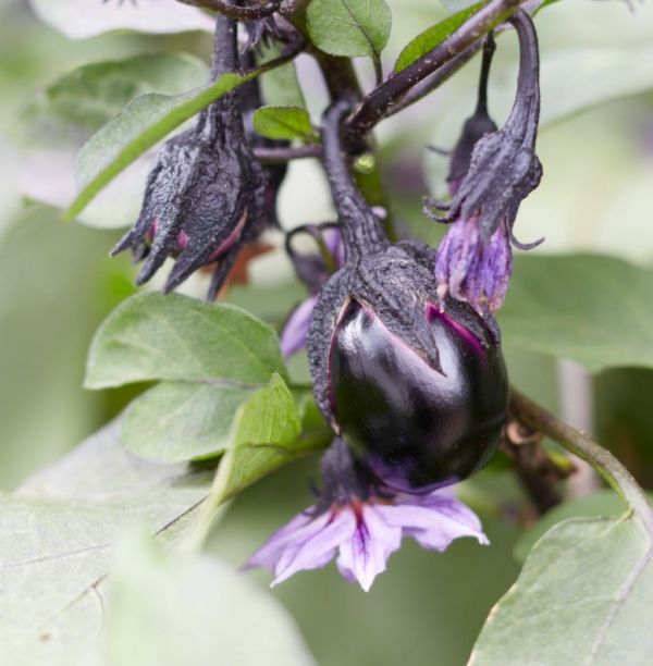 Petit plant adapté à la culture en pot produisant une multitude de petites aubergines violet foncé (noir)